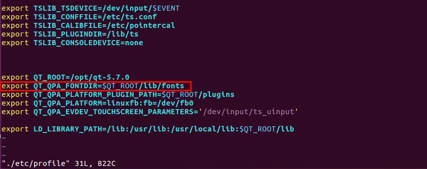 打开根文件系统的/etc/profile,添加字库的环境变量,注意这里字库的环境变量一定要写在QT库的路径下面