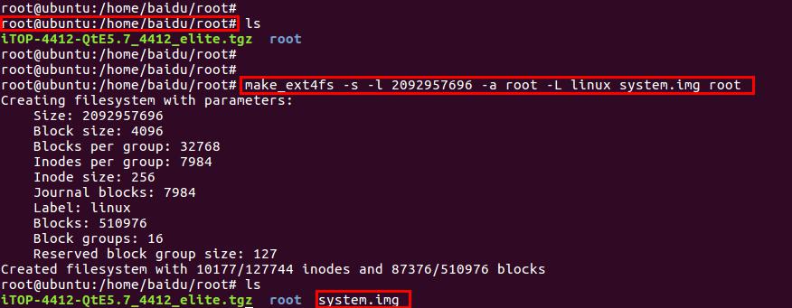 然后我们回到我们解压根文件系统的目录下,我们输入以下命令生成文件系统,注意这里的我们指定的linux的空间大小为2G,所以我们在烧写的时候要使用2G的分区,也就是命令fdisk -c 0 2048 300 300