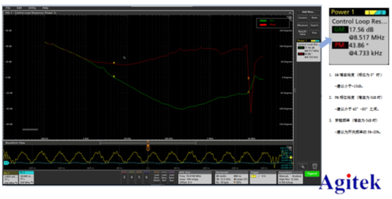 泰克环路响应测试方案使用一台任意波函数发生器AFG提供一个单一的源扫描指定的频率范围,画出每一点的振幅和相位。信号通过信号注入器(如PIC OTEST公司J21xxA模型)引入控制环路,得到的增益图和相位图(波德图)用于自动计算增益和相位裕度,使用光标允许您查看任意频率上的增益和相位值,从而判定电源环路的稳定性。