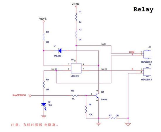 linux 系统上运行,文档以 Android 系统上测试为例,提供的 c 测试源码为“relay.c”以及编译好的程序“relay”。继电器模块原理图,如下图所示。通过,控制网络 XispSPIMISO 的电平来实现继电器的开和关。精英版底板对应扩展端子 J38(端子丝印为“GPIO”,挨着音频接口的端子)的管脚 10,全能板底板对应展端子 J10(端子丝印为“GPIO”,挨着蜂鸣器和独立按键的端子)的管脚 10。