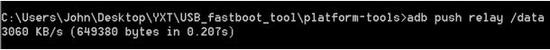 传文件的命令“adb push relay /data”,如下图所示。adb 上传文件具体可以参考用户使用手册 8.1 小节。