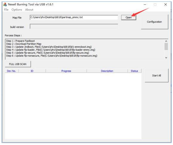2)点击烧写工具的 open 按钮,选择镜像文件一起的 partmap_emmc.txt 文件,