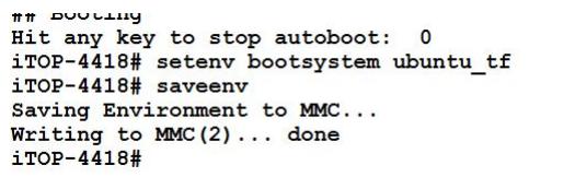 置命令是“setenv bootsystem ubuntu_tf”,然后使用“saveenv”保存,如下图所示。