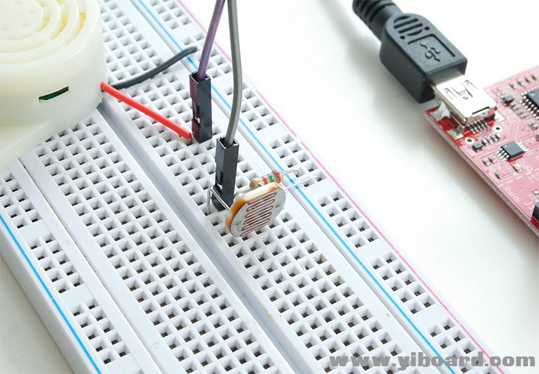 现在我们可以使用LaunchPad的ADC功能建立示例应用程序了。我们将使用激光二极管、光敏电阻、蜂鸣器、电阻和LaunchPad来构建激光绊线报警器。