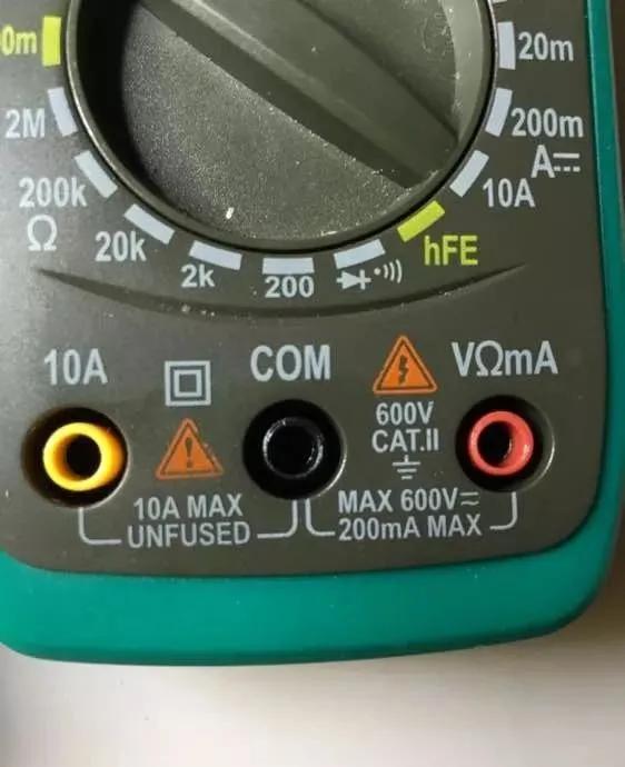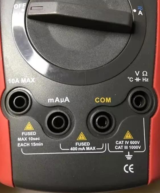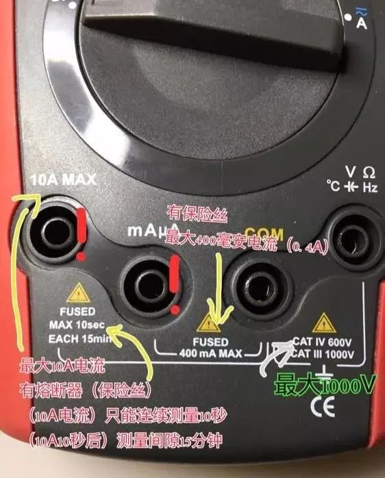 【要点III】万用表上比较危险的插孔,以及插孔附近标出的一些重要信息。