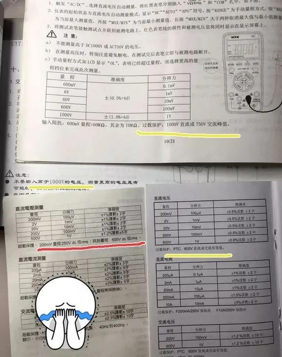 然后查看说明书… 发现直接打脸了… 宝工表蛋疼的分成2组保护(红线部分),其中200毫伏档 保护只到250V(还好还好,测市电不会坏……)