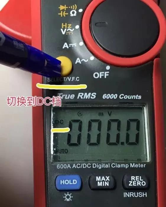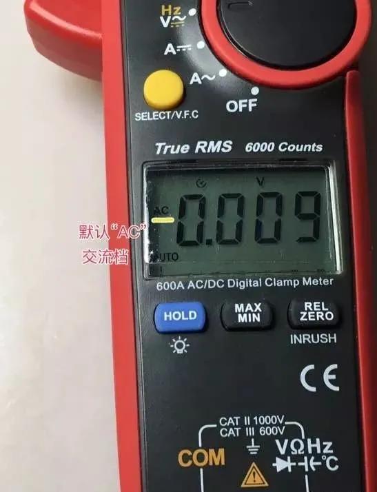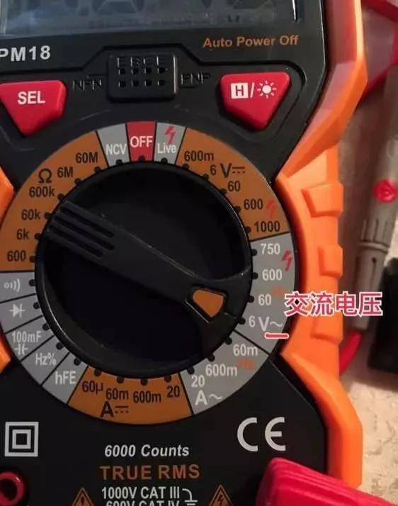 下面这款机型也是自动档。打到电压档时,默认测试类型是 “AC”交流电压,需要手动按“select按钮”切换电压测试类型到 “DC” 直流电压
