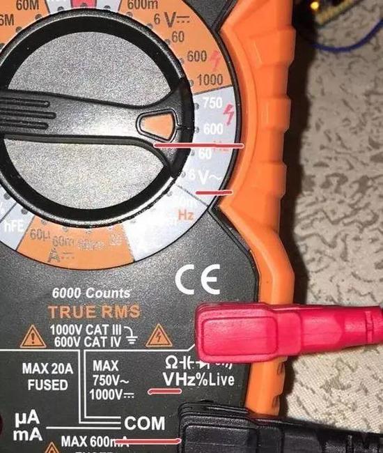 交流电压测量时,万用表表笔插法、档位如下图(画红线处依次是 1. 600V量程 2.交流电压档 3. 红笔插在电压测量孔 4. 黑笔插在公共com孔)