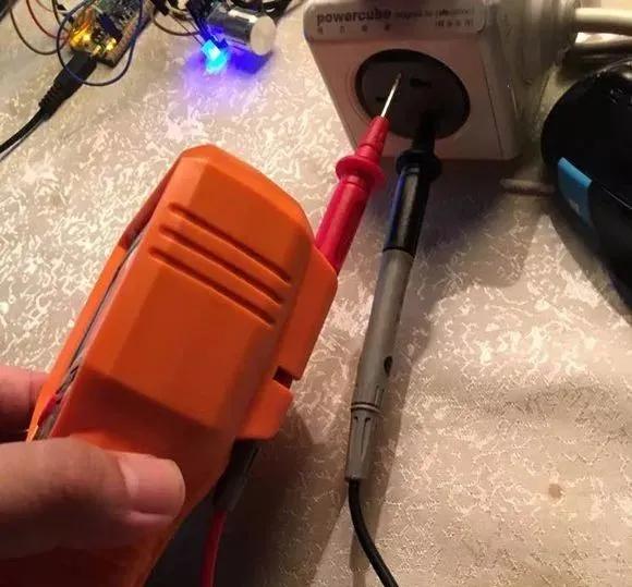 然后比较具有挑战性的是… 把表笔插到插座里~ 倒不是有什么危险 只是 1. SB国标插孔不用特尖表笔一般插不进 2. 即便插得进 笔针普遍不够长,表笔针不够长,接触不良得用手拿 左右捅一下然后固定。3. 交流电分零火不分正负,不要指望万用表交流档能直接测出零火线