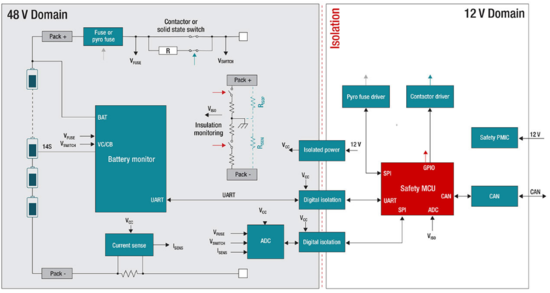 48V BMS由12V侧电池控制单元(BCU)和48V侧与电池分配单元(BDU)组合的电池监控单元(CSU)组成,如图 2 所示。发动机控制单元(ECU)与BMS分开,并通过CAN接口控制BMS。为了提高安全性,BCU和CSU通常是隔离的。