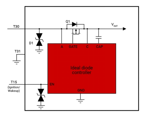 当点火开关打开时,T15 会连接到电池电压 (VBATT) 电位,从而使理想二极管的使能引脚处于逻辑高电平。处于有源模式下的理想二极管控制器,在启用电荷泵、控制和场效应晶体管 (FET) 驱动器电路的同时,主动控制外部 FET 以实现理想二极管运行。当车辆停车时,T15 降至 0V,理想二极管控制器利用关断状态做出响应,这会导致电荷泵和控制块关闭,从而使 IQ 消耗低于3µA。在这种工作模式下,外部 FET 关闭,FET 的体二极管形成正向传导路径,为负载供电。该方案需要额外向 ECU 接线。