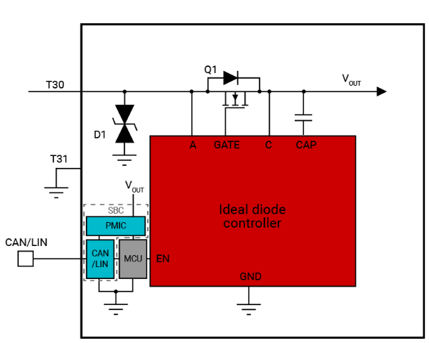 车辆中的 CAN 收发器将消息从通信总线转换到各自的控制器(通常是 MCU)。收发器可以通过发出进入待机模式直到被唤醒的命令,来指示何时不需要相关功能。此时中继消息指示控制器会传递将系统置于低功耗状态的指令,其实现方式是使理想二极管控制器的使能信号处于逻辑低电平。借助更先进的收发器和系统基础芯片,一个器件可以处理此过程的多种功能,并过渡到低功耗状态或进行唤醒。