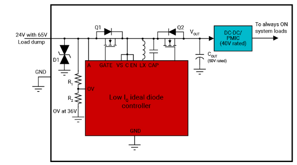 这些理想二极管控制器支持具有有源整流的电池反向保护,以及采用背对背 FET 拓扑的负载断开 FET 控制,以在系统故障(例如过压事件)期间保护下游,如图 4 所示。