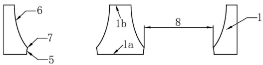 图1为本发明提出的用于蒸镀的精密金属遮罩的结构图,其中包括金属基材1,它的其中一个侧面为第一主表面1a,另一侧面为第二主表面1b,金属基材上开通若干暴露孔,暴露孔在第一主表面上设置第一蚀刻孔5,在第二主表面上设置第二蚀刻孔6,两蚀刻孔中心相重合,呈连通状态,蚀刻孔的外口大、内口小,且外口与内口之间通过凹弧孔壁过渡衔接,第一蚀刻孔与第二蚀刻孔的衔接处形成交界夹角7,夹角大于90°,衔接处为暴露孔的高精度孔径8。