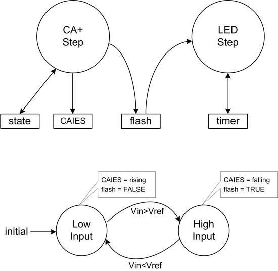 这个例子有意思的地方在于,展示了数据流程图(Data Flow Diagram, DFD)和状态转换图(State Transition Diagram, STD)这两个重要的概念。两个中断程序分别处理来自Timer0_A和CA+的中断,形成两个“process”,它们有自身独有的变量/参数,同时还共享了flash(LED是否闪烁)这一变量。此外,CA+的中断程序包含HIGH_INPUT和LOW_INPUT两种状态,是一个非常简单的状态机。