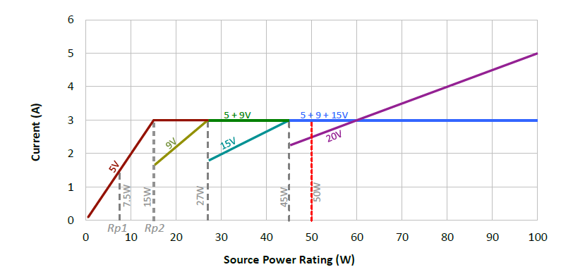 对于便携式电子设备,充电器的高功率能力非常重要,因为这意味着设备电池可以更快地完成充电。USB PD 3.0标准定义了电源输出电压和功率规范,以确保不同PD电源和设备之间的兼容性。根据其额定功率,电源输出电压为5V、9V、15V和20V四个电压等级,允许通过的最大电流为3A。最大电流水平也可以提高至5A,但需要提供一条特殊的、带电气标记的线缆以确保安全。