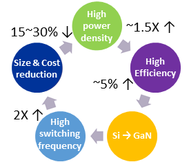 毫无疑问,GaN是实现电源小型化和高功率密度的关键器件。在一个65W手机快充的典型应用中,用氮化镓功率器件替代传统硅器件,把开关频率提高到原先的2倍,可以实现近5%的效率提升,节省15%~30%的系统体积和成本。目前移动类消费电子产品的电池续航能力依然没有实质性突破,所以USB-PD快充仍然是目前解决移动电子设备电池续航焦虑的重要手段。