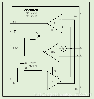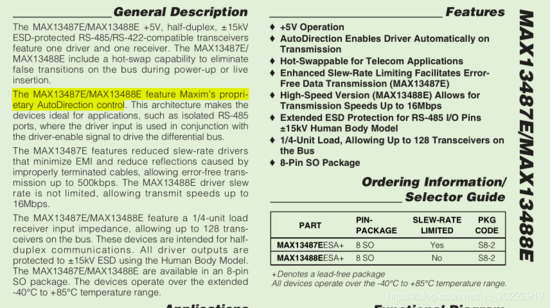 网上查找资料后发现485的自动收发硬件电路有很多,通过外部搭建的模拟电路就可以实现接收和发送数据的自动切换,这种电路的器件参数和稳定性可靠性都要根据使用环境去测试,使用起来比较麻烦。查找资料后发现MAX13487E这个芯片自带了接收和发送自动切换功能。现在看一下这个芯片的使用方法。
