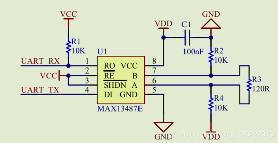 将2、3脚都接VCC,这样485通信时就可以像操作串口那样,直接去读数据或者写数据了,代码中就不用关心接收和发送引脚的电平了。
