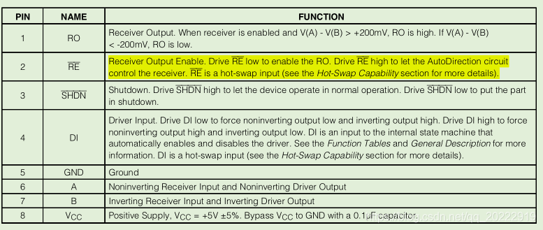 通过引脚功能可以看到,2脚为低电平时为接收功能,2脚为高电平时为自动方向控制功能。3脚为高电平时为正常操作模式,3脚为低电平时为关断模式。将2脚和3脚都接高电平时,就能实现自动收发数据自动切换了。