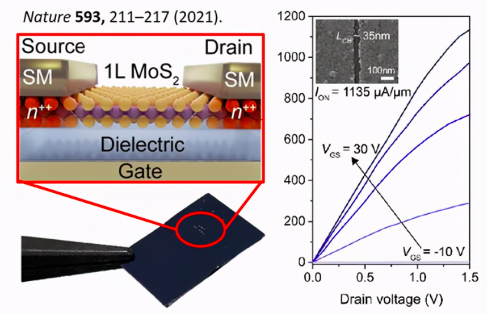 MIT团队最先发现,在「二维材料」上搭配「半金属铋(Bi)」的电极,能大幅降低电阻并提高传输电流。
