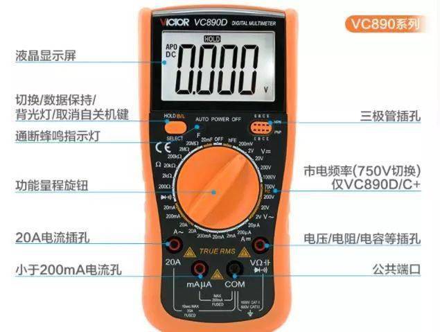 1. 外形结构:胜利VC890D型数字式万用表的面板如下图所示,前面板包括液晶显示器、电源开关、量程开关、输入插孔等,后面板装有电池盒。