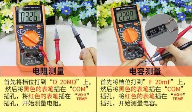 (5)当使用数字式万用表电阻档测量晶体管、电解电容等元器件时,应注意,红表笔接"V·Ω"插孔,带正电;黑表笔接"COM"插孔,带负电