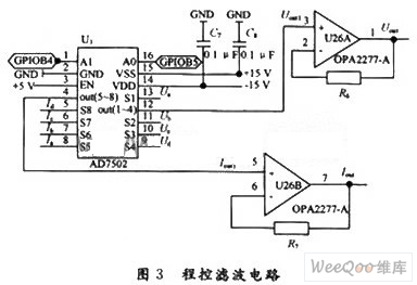 系统中选用数据选择器AD7502作为四路电压和四路电流信号的模拟开关。滤波电路选用OPA2277来实现,电路原理图如图3所示。其中,AD7502的A0,A1接DSP通用I/O口的GPIOB4,GPIOB5口,EN引脚接高电平。GPIOB4,GPIOB5输出不同值来控制AD7502不同通道的接通,从而将8路信号依次送人两片A/D转换器。