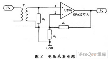 本系统采集三相电压、三相电流以及中性线的两路电压和电流信号。电压和电流的采样电路类似,电压采用电压互感器,电流采用电流互感器,通过运放OPA2277组成电压和电流采样电路。电压采集电路如图2所示。图2中,T1为电压互感器。电压互感器出来的信号通过OPA2277处理后送入数据选择器AD7502的S1输入引脚。其他7路电压和电流信号分别送入AD7502的另外7个输入引脚。