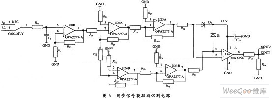 为了实现A/D转换器的交流同步采样,本方案的设计电路如图5所示。方案选用多个OPA2277和比较器MAX998来组成信号的获取与识别电路,从而克服了非整周期采样带来的频率泄露误差,实现严格的同步采样和等间隔采样。图5中,K3C为继电器,用作开关使用,用来通断选择获取的一路交流电压信号和一路交流电流信号。OPA2277组成放大和滤波电路。二极管D2,D3的作用是保护比较器MAX998,防止电压过大而击穿MAX998。