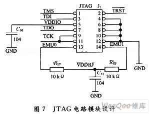 在对DSP系统进行硬件仿真时,可以通过JTAG边界扫描接口对DSP内部的数据存储器、程序存储器和控制寄存器进行在线监控,并能在TMS320F2812的开发环境CCS中把程序下载到DSP芯片进行硬件仿真。JTAG接口的原理图如图7所示。