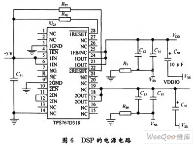 DSP系统主要由DSP芯片、电源电路、时钟电路、仿真和测试电路组成。由于TMS320F2812的电源系统既有3.3 V的数字和模拟电源,又有1.8 V的数字电源,电源的安全和可靠是系统运行的根本保证,所以需要将常用的5 V电源转换成3.3 V和1.8 V电源。本设计选用TI公司的TPS767D318作为电源芯片,该芯片是专门为DSP的应用而设计的,可以提供3.3 V和1.8 V两路电压输出,其中每路输出均可提供最大为1 A的电流。TPS767D318同时具有电压监测功能。电源电路的设计如图6所示。此外,DSP的每个电源和地引脚不能悬空,数字模拟地要分离设计。