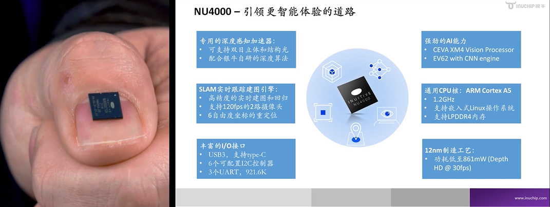 基于上述三大核心技术,银牛微电子推出了第二代芯片NU4000,集成的功能特性包括:专用的深度感知加速器,强劲的AI能力,高精度的实时建图和回归,通用CPU核,丰富的I/O接口,以及先进的12nm制造工艺。