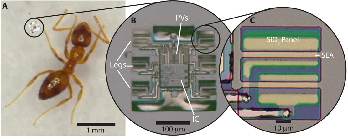 Antbots由三个主要系统组成:一个接受光作为动力的光伏电池、一个控制和引导该动力的微小集成电路及一套它用来滑行的铰链腿。