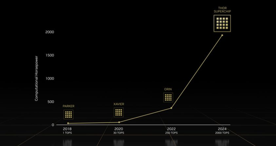 2.无与伦比的强大算力。从2018年的Parker到现如今的Orin,已经实现254倍的算力增长。英伟达在2022GTC演讲中发布了下一代SoC单芯片,也就是当前大热的Orin系统的接任者,NVIDIADRIVEThor。去年黄仁勋还说会有一个1000TOPS的Atlan,结果今年就直接说Atlan继任者来了,是2000TOPS算力的Thor。也正因为Thor太强了,并且同样将在2025年装车,所以英伟达就干脆取消了Atlan。