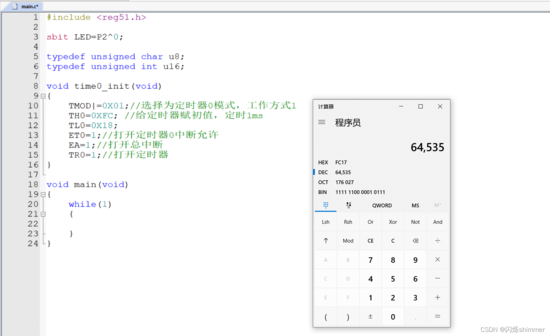 假设定时1ms一次,那么2的16次方等于65536,定时1ms,就等于65536-1000=64536,再把十进制换成十六进制,如下图的例子。