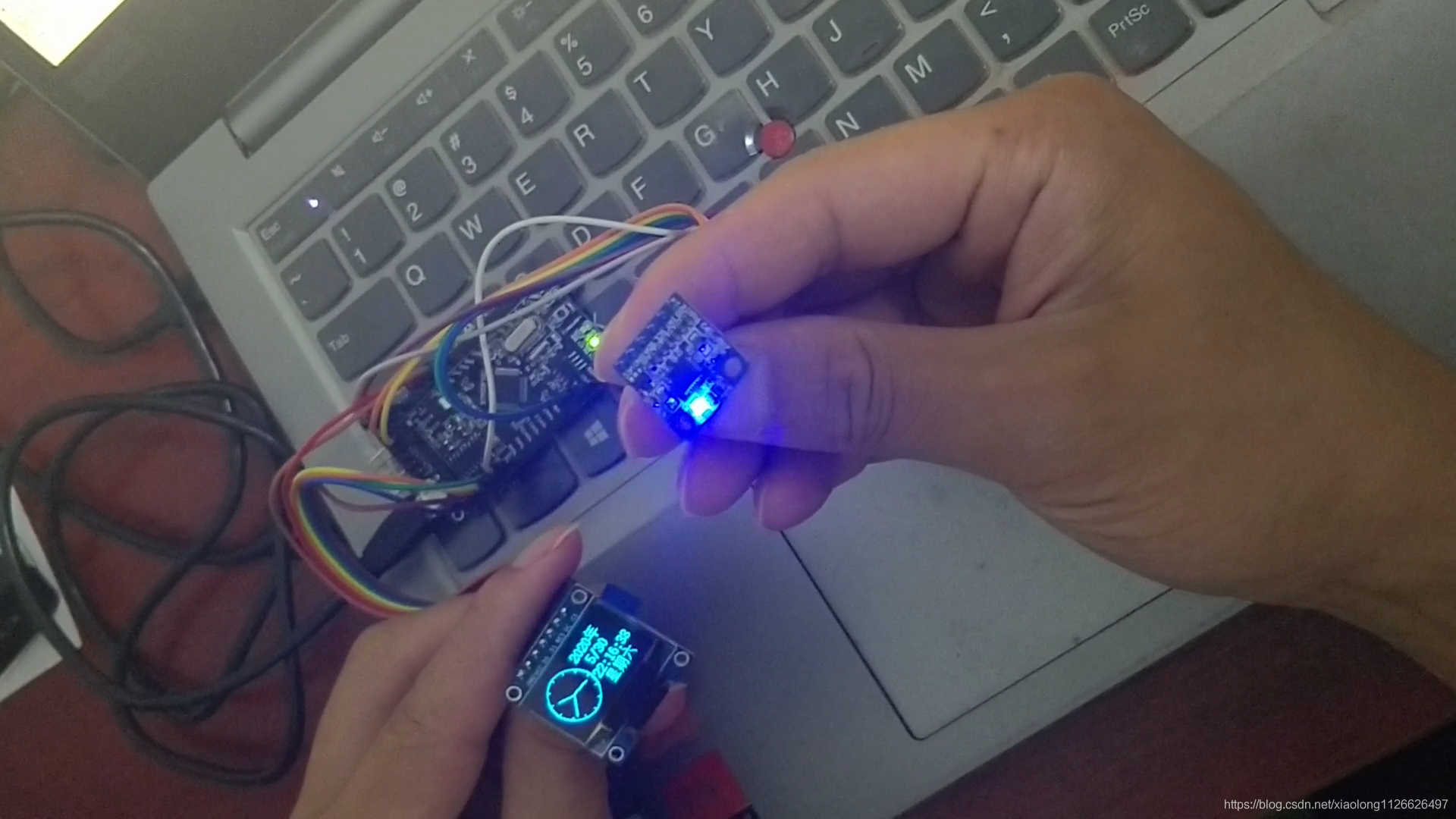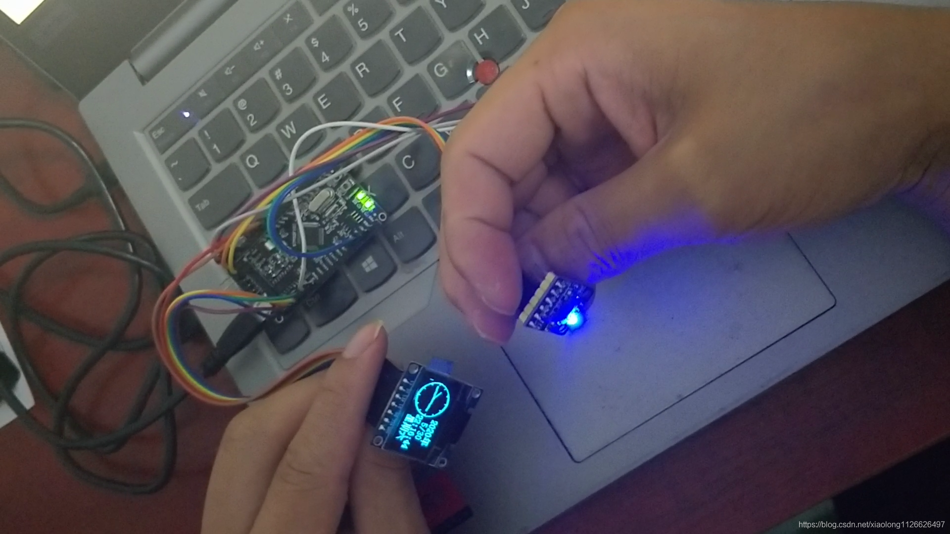 时钟可以根据MPU6050测量的姿态自动调整显示画面方向,也就是倒着拿、横着拿、反着拿都可以让时间显示是正对着自己的,时间支持自己调整,支持串口校准。可以按键切换页面查看环境温度显示。