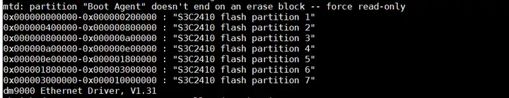 上面部分宏的定义,如下所示: MTDPART_OFS_RETAIN: 填在offset里,表示先后保留多少size空间大小 MTDPART_OFS_NXTBLK: 填在offset里,表示从下一个块开始 MTDPART_OFS_APPEND: 填在offset里,表示该分区位置附加在上个分区结束的地址上 MTDPART_SIZ_FULL: 填在size里,表示剩下的内存size都归于该分区 若需要mini2440的机器ID,则还需要修改mini2440单板对应的mach-mini2440.c 因为该单板的mtd分区也不对,将里面的mini2440_default_nand_part[]内容改为和上面一样,拷贝文件到ubuntu重新编译下载内核