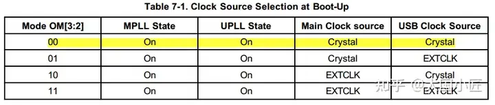 在nRESET的上升沿锁存OM[3:2]引脚,两个引脚在原理图中都接地,所以都为低电平。所以MPLL的时钟源来源于晶振;UPLL的时钟源也来源于晶振。