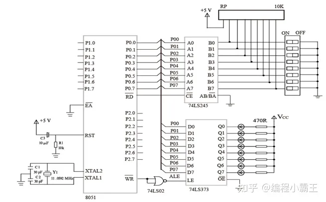 8051单片机使用74LS373和74LS245展I/O口,分别连接发光二极管和拨码开关,要求编写控制程序,通过开关的拨动控制发光二极管的亮灭。