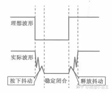 由于机械触点的弹性作用,一个按键开关在闭合时不会马上稳定地接通,在断开时也不会一下子断开。因而在闭合及断开的瞬间均伴随有一连串的抖动,与单片机I/O口相接的一端的电压会出现相应的变化,如图6所示。