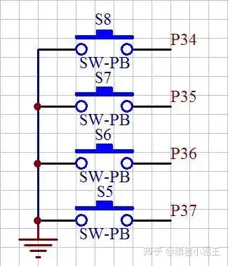 下面我写一个简单的程序,功能为:当一个键按下时,让一个发光二极管发光,我们先看下按键模块在实验板上的原理图,如图7和图8所示。