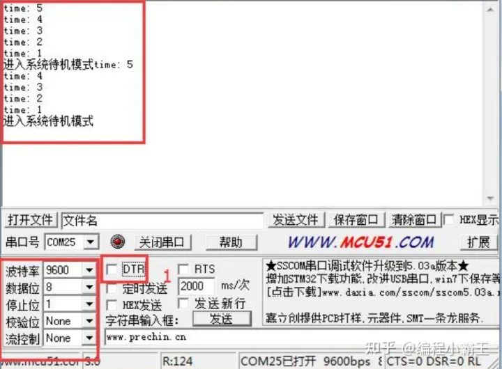 将工程程序编译后下载到开发板内,可以看到系统运行时 D1 指示灯不断闪烁,5 秒钟后进入待机模式,此时 D1 指示灯熄灭。当按下 K_UP 按键或复位按键时,待机模式被唤醒,系统重新运行,同时串口打印提示信息。如果想在串口调试助手上看到输出信息,可以打开“串口调试助手”,首先勾选下标号 1 DTR 框,然后再取消勾选。这是因为此串口助手启动时会把系统复位住, 通过 DTR 状态切换下即可。然后设置好波特率等参数后,串口助手上即会收到 printf发送过来的信息。(串口助手上先勾选下标号1 DTR框,然后再取消勾选)如下图所示。