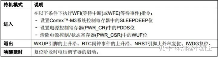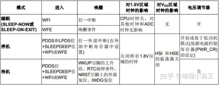 这三种模式所需的功耗是逐级递减,也就是说待机模式功耗是最低的。三种低功耗模式汇总表如下图所示: