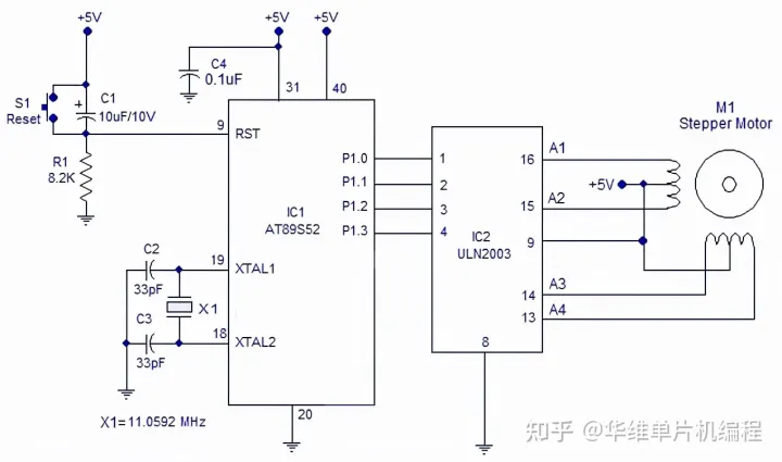将步进电机按照电路图连接到 8051 的P1.0、P1.1、P1.2 和 P1.3 引脚分别用于控制步进电机的 A1、A2、A3 和 A4 相。ULN2003 用于驱动步进电机的各个相位。