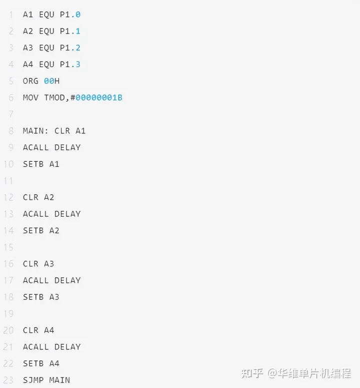 程序首先将 P1.0 清零以启动步进电机(A1),此状态保持 65ms,然后设置 P1.0 为1以停用电机的第 1 相。然后对 P1.1 到 P1.3 重复相同的过程,并一遍又一遍地重复整个循环,使电机沿顺时针方向旋转。