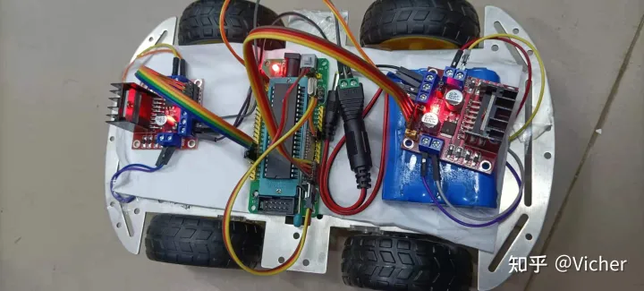 我接线是先用12v的16850电池组给其中一个l298n驱动供电,然后将两个l298n的12v和GND接口用杜邦线相连接起来,然后在用其中一个l298n的5v和GND接口给单片机最小系统供电(千万别连错了,电压小了,单片机无法正常工作;电压大了,单片机芯片就会被烧坏)。