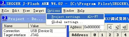 2、打开J-Flash ARM后,先进行芯片选项设置,打开OptionsàProject settings 如下图所示。