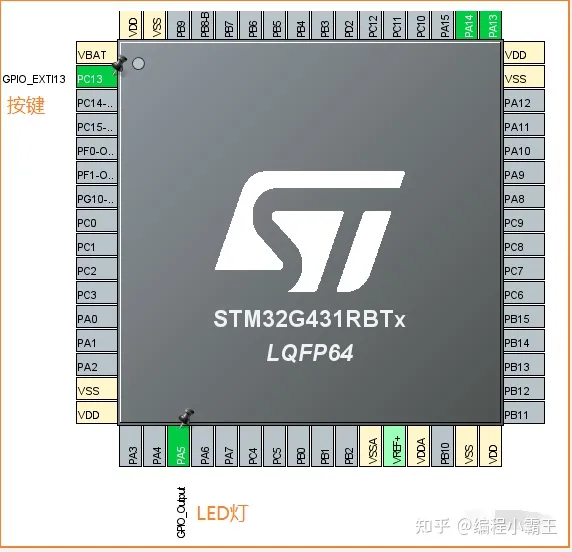 本演示例程基于STM32G4系列的Nucleo板进行,按键【PC.13】用来触发中断,该中断事件被配置DMA请求源。板上有个LED灯与PA.5相连。例程中通过DMA传输来修改GPIOA输出寄存器的内容来改变亮灯情况。