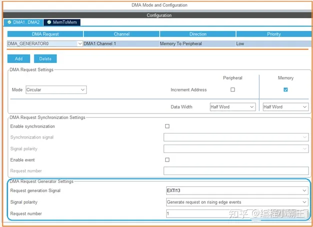 然后,对DMA进行配置。配置也比较简单,见下图。注意DMA请求源并非常规的外设事件,而是DMA请求发生器相关通道,关于它的配置在图中下方的蓝色方框那里。
